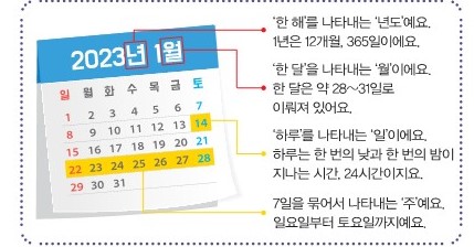 우리가 주로 사용하는 달력은 1년을 기준으로 만들어요. 1년은 열두 달이니까, 한 해의 달력엔 1월부터 12월까지 적혀 있지요. 한 달(월)은 28~31개의 ‘일’로 이뤄져 있어요. 또, 고대 사람들은 7일을 기준으로 날(일)에 이름을 붙였어요. 그게 바로 ‘요일’이에요. 태양계의 천체인 태양, 달, 화성, 수성, 목성, 금성, 토성의 순서로 일, 월, 화, 수, 목, 금, 토요일이 되었답니다.