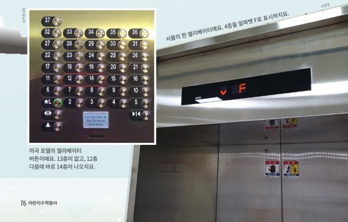 그러면 4가 불운의 숫자라는 이야기는 어디에서 나왔을까요? 바로 동양 나라들이에요. 죽음을 뜻하는 한자 ‘죽을 사(死)’와 숫자 4의 발음이 같기 때문이지요. 한자를 쓰는 한국, 중국, 일본 모두 4를 불운의 숫자로 여겨요. 그래서 세 나라에서는 건물의 층 번호를 매길 때 4 대신 영어 단어 Four의 첫 알파벳 F를 쓰기도 해요. 마찬가지로 서양 나라에서는 13 대신 영어 단어 Thirteen의 알파벳 T를 쓰거나, 아예 13층을 없애고 12층 다음을 14층으로 부른답니다! 나라마다 행운과 불운을 상징하는 숫자가 다르다니, 신기하지 않나요?