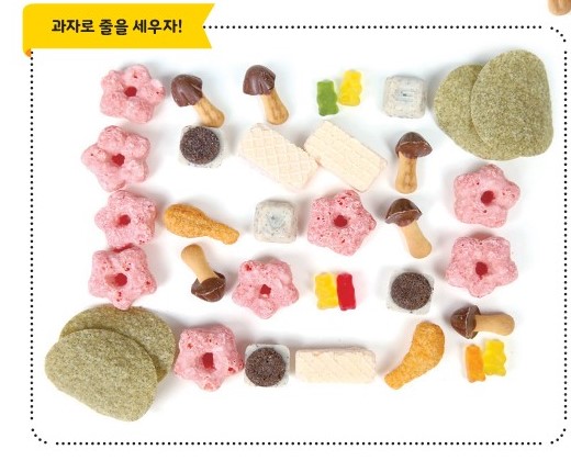 먹고 싶은, 아니, 개수를 세고 싶은 과자를 모두 꺼내 보았어요. 달콤한 딸기 과자, 짭조름한 감자 과자, 젤리, 초콜릿 과자가 한데 뒤섞여 있네요. 대체 몇 개지...? 여러분은 과자의 개수를 셀 수 있나요? 눈을 부릅뜨고 세어보세요. 눈이 너무 아프다고요? 역시 정리정돈은 언제나 중요한 법! 과자를 가지런히 놓아 볼까요?