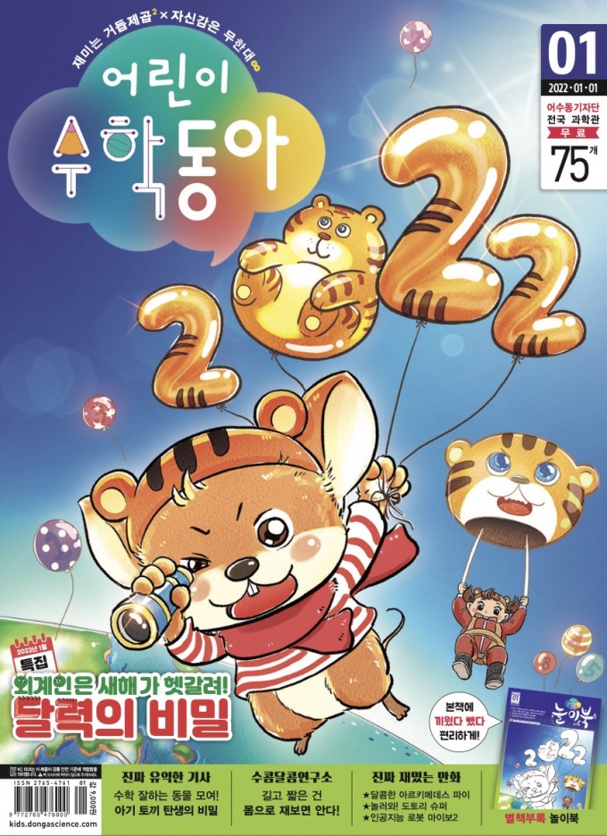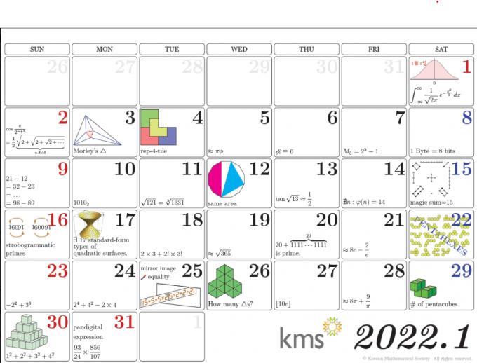 우리나라 수학자들의 연구기관인 대한 수학회(KMO)는 매년 수학달력을 제작 하고 있어요. 수학 퍼즐 전문가인 박부성 경남대학교 수학교육과 교수가 2014년 우리나라에서 열린 ‘세계수학자대회’를 기념해 처음 수학달력을 만들었어요. 당 시 뜨거운 인기를 얻어 매해 만들기로 했지요. 수학달력은 겉으로 봤을 땐 평범한 달력과 비슷해 보이지만, 자세히 보면 날 짜 밑에 퀴즈가 있어요. 퀴즈의 정답이 바로 오늘의 날짜이지요. 예를 들어 2월 1일 밑에는 ‘5-4’라고 적혀 있어요. 계산식뿐 아니라 도형 개수 세기, 각도 구하 기 등 여러 가지 수학으로 날짜를 표현했지요.
