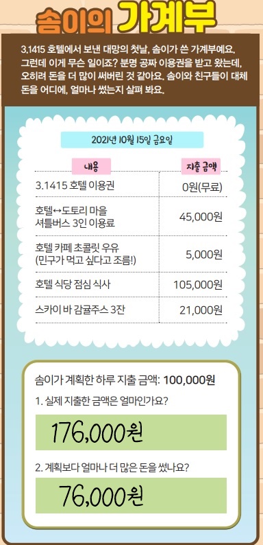 문제 1의 답은 가계부를 보고 지출 금액을 모두 더한 값이에요.