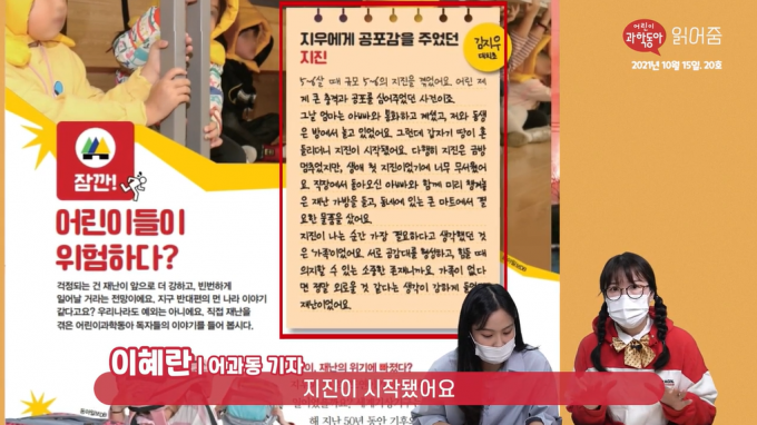 어과동 10월 15일자 특집 기사 '어린이가 살기 안전한 나라는?!'을 기획하신 어과동 이혜란 기자님이 어린이들이 재난에 취약한 이유를 알려주시고, 여러분들을 보호할 수 있는 대안을 알려 주실거에요^^
